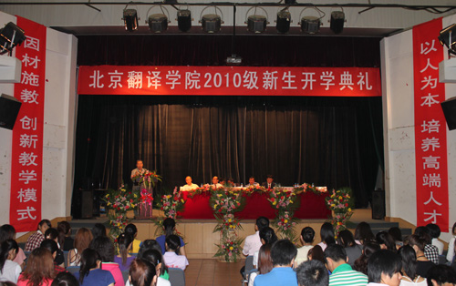 金秋九月,丹桂飘香,2010年9月1日上午,乘着金秋的凉爽,在学院大礼堂,北京翻译学院隆重召开了2010级新生开学典礼,参加开学典礼的有近500名2010级新生,他们带着对大学生活的渴望、带着对理想和知识的渴求、带着父母亲人的厚望与重托,从祖国各地来到这里,融入北译这个充满生机与活力的集体。