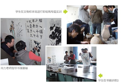 学生每两周在市内博物馆、众多著名拍卖公司、古玩市场开展实训调研、参观、学习等活动,每学年有一次为期三周的外地实训基地的专项能力实训,实训地点繁多,如北京、河南、陕西西安、江西景德镇、浙江、上海、江苏、江西、四川、湖南、湖北等,对开拓学生的视野、增强学生的实训经验提供了良好的契机。