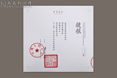内页是通知书正文,采用描金粉纸。中间顶端是中国人民大学中英文校训——“实事求是”和“Seeking Truth from Facts”,右侧的“捷报”二字尤为醒目,体现新生收到录取通知书时的喜悦心情。整体行文设计从右至左,由上而下,最右侧写着“中国人民大学是教育部批准的具有高等学历教育招生资格的普通高等学校”,中间则是新生的录取专业信息和报到时间,其中新生姓名全部为毛笔字体书写,左侧落款加盖中国人民大学校章和方印,并有校长签名。