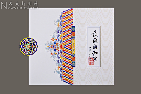 录取通知书由内外两部分组成,折页打开和扣合处采用磁石封印。封面设计简洁,在“中国人民大学”六字上加盖“国民表率、社会栋梁”八字方印;背面下端为江山社稷图案,顶端是万花簇拥的中国人民大学校徽,体现人大学子争做国民表率;封面中缝是一方中国传统建筑梁柱,象征人大学子敢为社会栋梁。