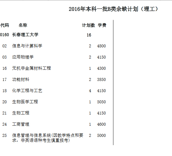 2016年天津本科一批B类第二次征集志愿计划(理工)