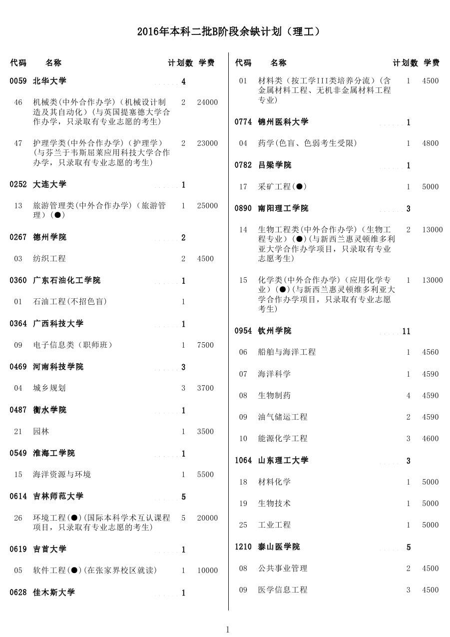 2016年天津本科二批B阶段征集志愿计划(理工)