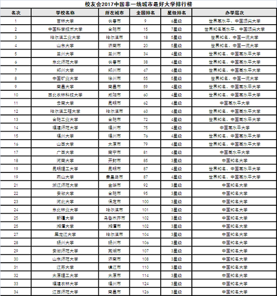 中国非一线城市(二线、三线、四线和五线城市)哪所大学的综合实力最强、办学水平最高?哪些大学跻身2017中国大学排行榜100强?哪些大学跻身2017世界一流大学、世界高水平大学和中国一流大学行列?哪些非一线城市的大学最具实力跻身国家“双一流”战略?艾瑞深中国校友会网《2017中国大学评价研究报告》最新发布2017中国城市大学竞争力排行榜和2017中国各城市最好大学排行榜等榜单。北京、上海、武汉、南京和西安雄居2017中国城市大学竞争力排行榜前5强;北京大学和清华大学荣膺2017中国八星级大学,跻身世界一流大学、中国最顶尖大学行列,堪称2017年中国最好的大学,雄居2017中国一线城市最好大学排行榜冠亚军。值得关注的是,全国非一线城市有23所高校跻身2017中国大学排行榜100强,5所高校跻身2017中国一流大学行列。