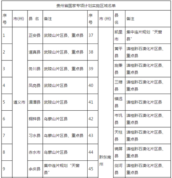 教育部直属高校、部属高校、教育部批准的省外高校及我省贵州大学将面向全省66个集中连片特殊困难县、国家扶贫开发工作重点县和5个集中连片规划“天窗县”(简称贫困地区,见附件)实施国家专项计划,招生计划由教育部统一下达,并在贵州省2017年高考高校招生专业目录上公布。