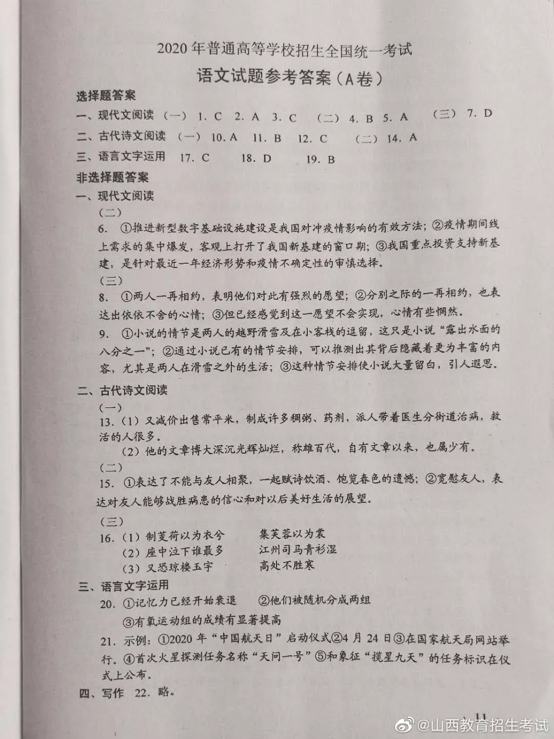 语文:2020年高考真题答案(全国卷1)