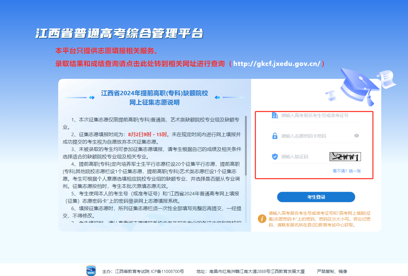 1、在填报征集志愿期间,登录江西省教育招生考试院网站;