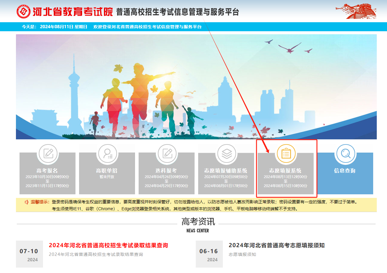 参与河北专科批征集补录的考生须在8月13日8:00-18:00进入河北省教育招生考试院“普通高校招生考试信息管理与服务平台”,完成志愿填报工作,逾期将无法提交。