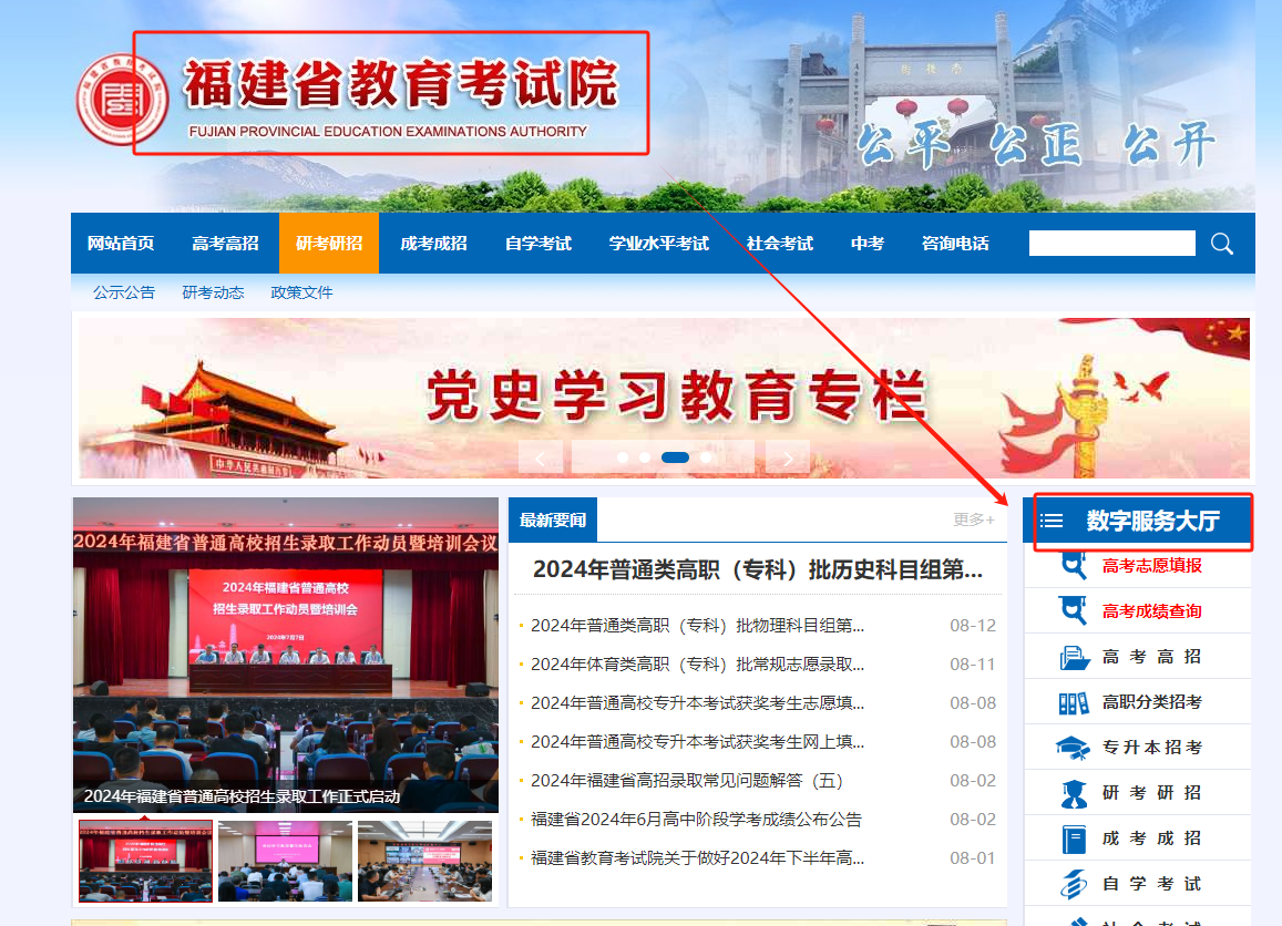 2、“数字服务大厅——高考高招”栏目,点击“高考录取信息查询”,凭本人账号、密码进入“福建省2024年普通高校招生录取查询”平台查询高考录取结果。