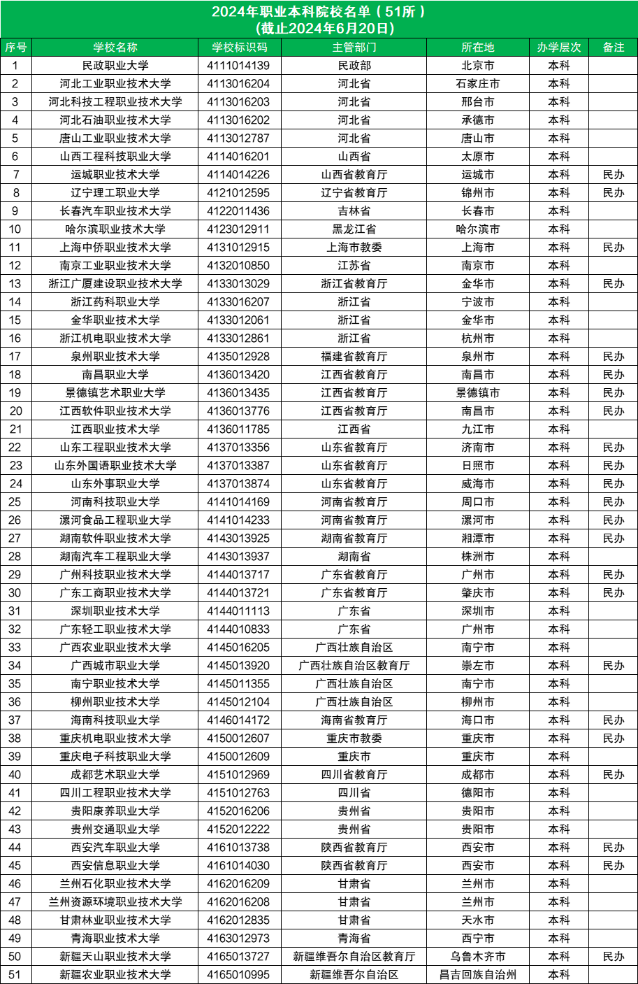根据教育部发布的全国高等学校名单显示,截至2024年6月20日,全国获得教育部正式批准的职业本科大学共有51所,其中公办院校有28所。