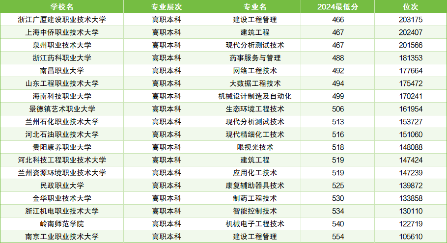 2024年在浙江招生的职业本科大学分数范围在466分~554分之间,对应最低位次在105610名~203175名之间。