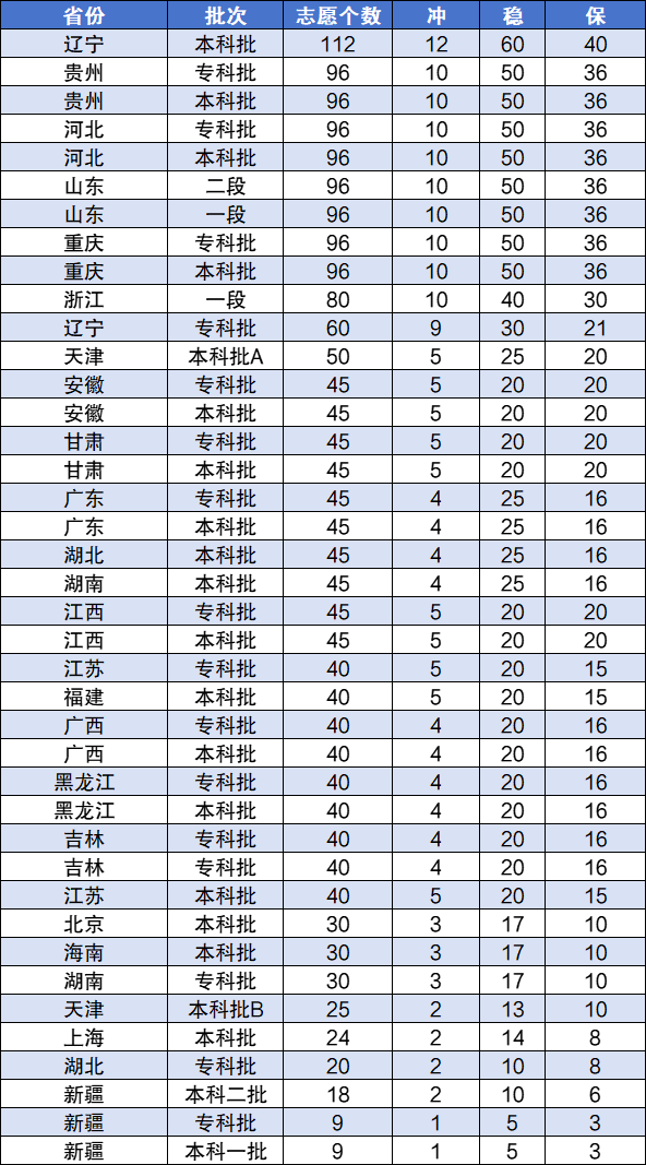 不同地区可以填报的志愿数量不同,下面是全国新高考地区高考志愿个数汇总表,以及冲稳保比例安排,可以参考。另外文中并为包含山西、内蒙古、河南、四川、云南、陕西、青海、宁夏这八个地区。因为这八个省份比较特殊,2025年首次实行新高考,志愿个数相较2024年变化较大,具体并不确定,因此未整理。