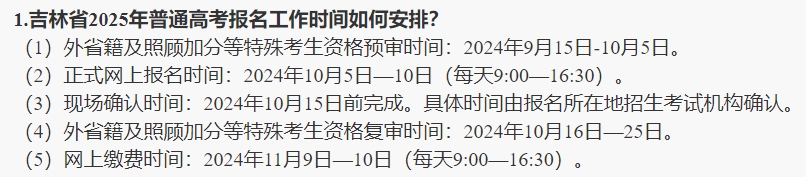 根据吉林省教育考生院最新发布的高考报名工作相关事项问答,2025年吉林高考的正式网上报名时间为2024年10月5日至10日(每天9:00-16:30),对于外省籍及照顾加分等特殊考生,资格预审时间为2024年9月15日至10月5日,具体安排如下: