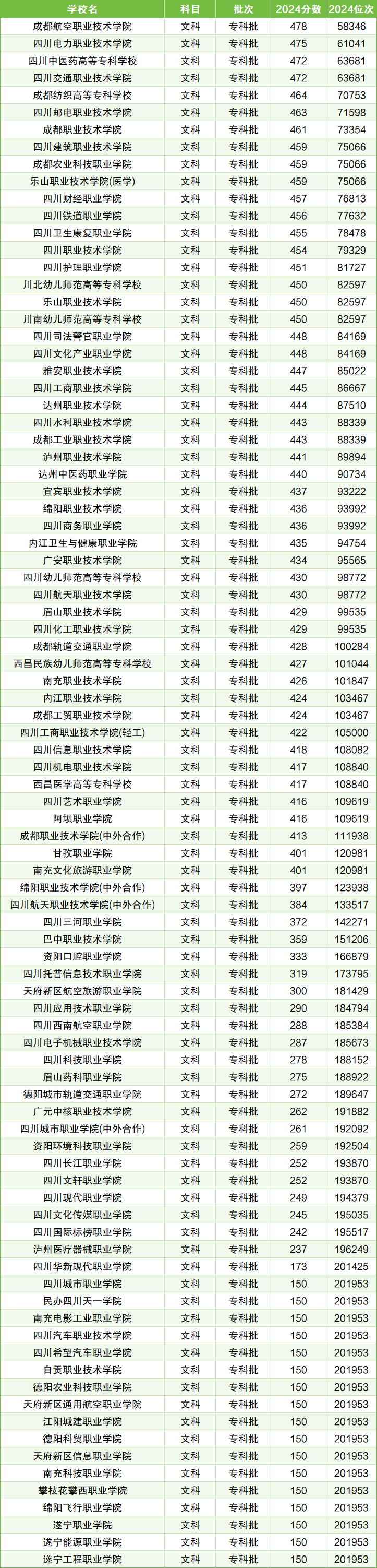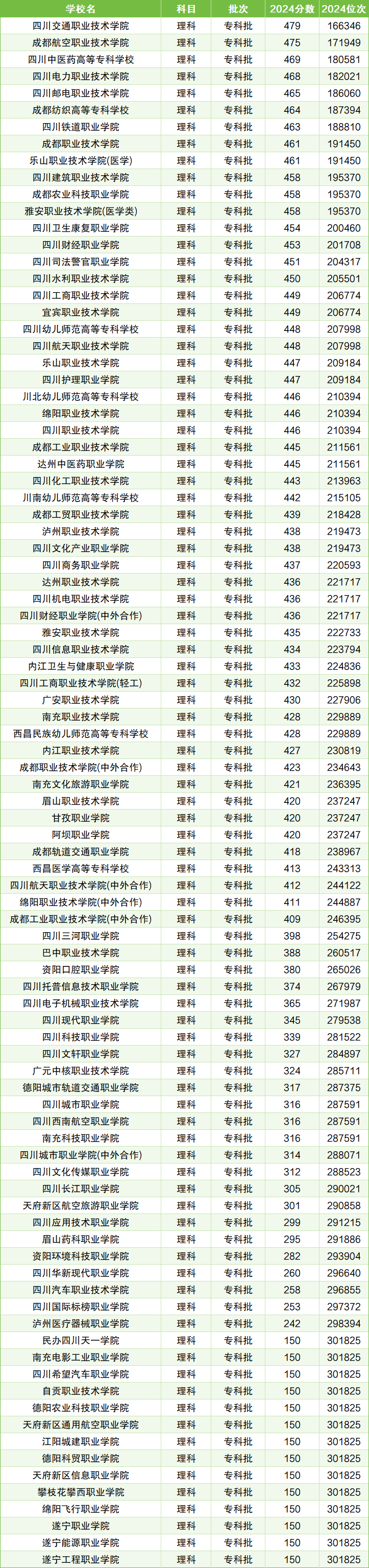 以四川2024年的招生数据为例,在理科方面,四川各专科院校的录取线在150-479分之间,位次在166346-301825之间;在文科方面,四川各专科院校的录取线在150-478分之间,位次在58346-201953之间。