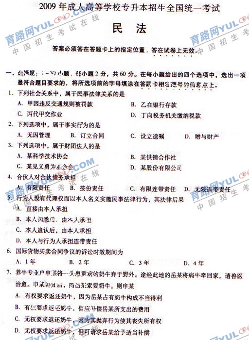 2009年成人高考专升本民法真题及答案