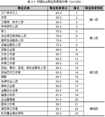 11月23日报道,网民心目中哪些社会职业形象最好?环球舆情调查中心联合环球网开展的有关中国社会职业形象网民态度调查显示,“工厂技术工人”、“农民”、和“工程师、技术人员”位列前三甲,“科学研究人员”和“军人”分列四五位。 本次调查以国家统计局第五次全国人口普查结果中的“劳动力市场职业分类”为依据,将中国目前的社会职业分成23类。环球舆情调查中心在分类获得社会职业形象“正面”、“负面”和“既不正面也不负面”等调查数据的基础上,对这三个维度分别赋予不同的权重,具体为“正面”赋值90分,“既不正面也不负面”赋值70分,“负面”赋值50分,并以此为依据进行加权计算,最终得出各类职业的职业形象平均分。