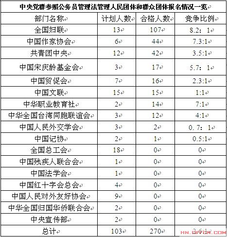 目前,中央党群参照公务员管理法管理事业单位报名人数最多的部门为全国妇联,该部门共招录13个职位、13个人,目前共有107人报名,竞争比例为8.2:1.竞争最激烈的职位还是来自全国妇联,为全国妇联办公厅的文秘综合岗主任科员及以下职位,该职位计划招录人数1人,目前合格人数43人,竞争比例为43:1.