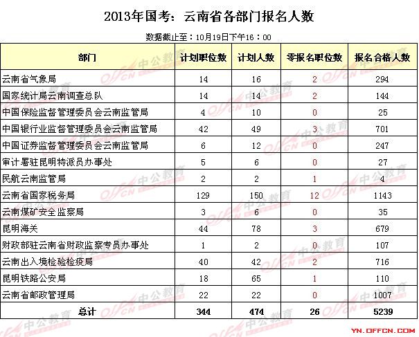 [19日16时数据]:云南国考5239人通过审核26个职位无人报考