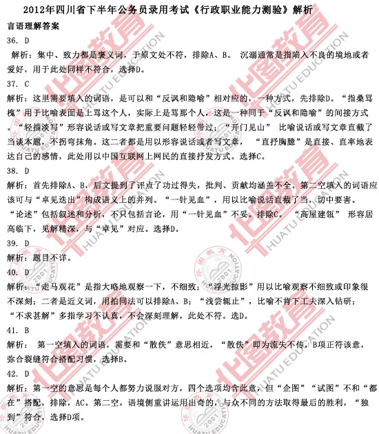 2012下半年四川公务员行测言语理解答案(华图)