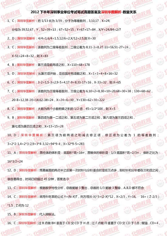 2012深圳事业单位考试数量关系真题答案