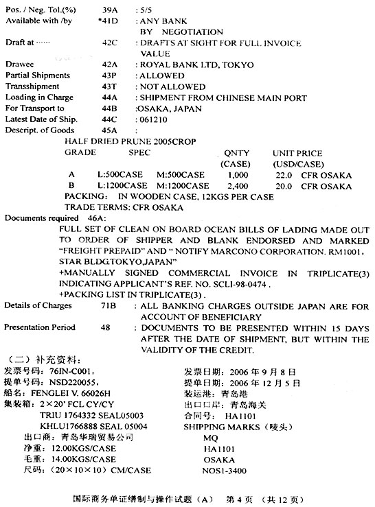 2013年单证员基础理论第七章:根据资料修改海运提单