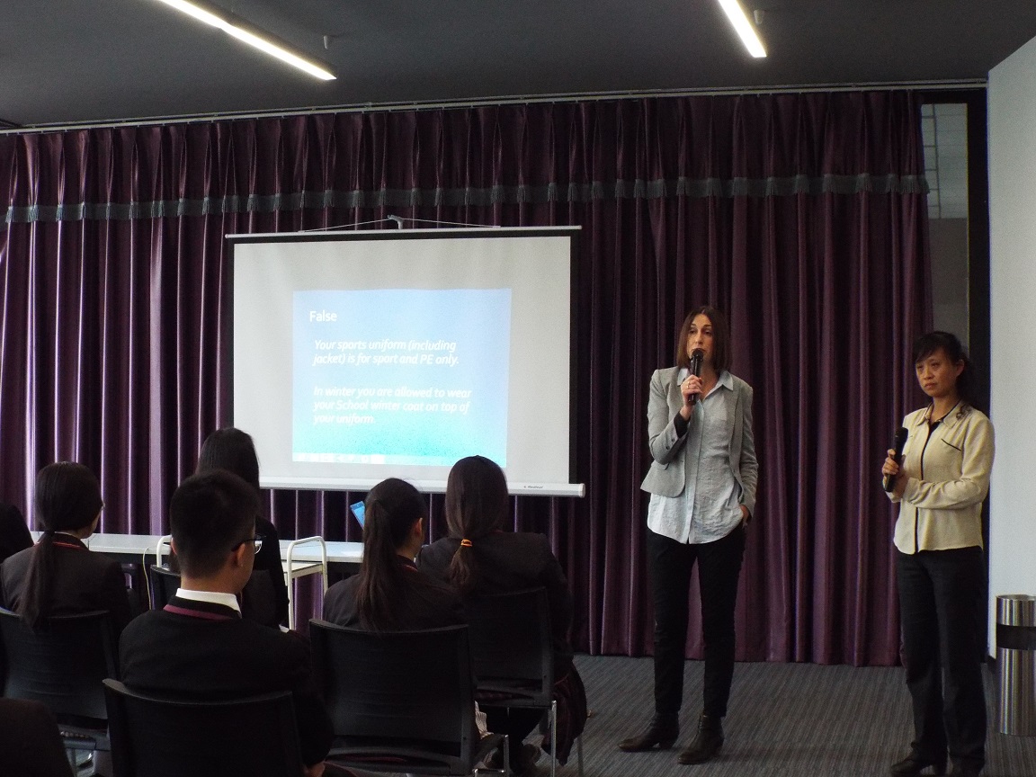 近期天气阴晴不定,学生的校服也显得不太统一,Lisa Lanati老师及11年级几位同学现身说法,向大家展示了冬季与夏季校服的正确穿法,同时对日常校服穿着中存在的问题——首饰、发型、领带、袜子等,一一作了规范,让大家明确正确的着装要求。张达老师从“尊重”的角度出发,和同学们一起探讨了怎样判断事情是否正确?如何去做正确的事情?同学间如何文明、友善的相处?为什么要遵守校纪校规等问题。