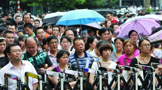 某外国语学校考场外,家长在焦急等待孩子以及考试结果。