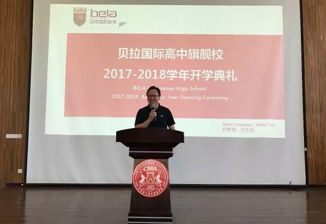 贝拉集团总裁李松博士围绕“信任”,“坚持”,”陪伴”这三个方面,介绍了国际教育的优势及难点,对未来升学,择校等方面也作了进一步的说明,给予新生鼓舞与动力。李博士还分享了自己学习的小故事,以此激励学生要不断发扬刻苦求学的精神,要求他们尽快适应,打牢语言基础,为未来异国留学做好充分的准备。