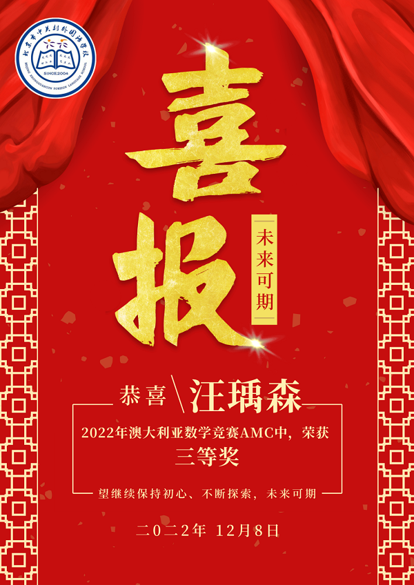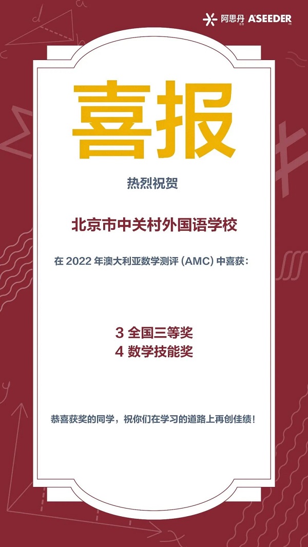 2022年AWC(Australian Mathematics Competition,澳大利亚数学测评)最终成绩揭晓。今年,北京中关村外国语学校国际部有7名学生参赛,他们分别获得了全国三等奖和数学技能奖,取得了参赛人员100%获奖的亮眼成绩。