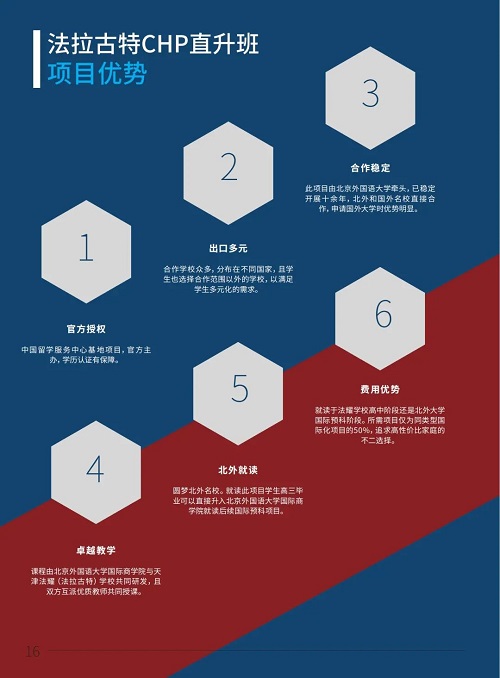 北京外国语大学国际商学院法拉古特CHP直升班(下文简称"“北外国商法拉古特CHP直升班,天津法拉古特隶属于法耀教育集团)旨在为有志于通过该项目进入北京外国语大学和国外大学就读本科专业的准高中学生提供系统的英语、商学、经济学和人文学科等多元化综合教育,着重培养具有坚实的英语基础、独立自主的学习和思考能力、良好的国际化视野与跨文化沟通能力的优秀学子,并为其申请国外高等学府提供一个全方位的国际化培养方案。