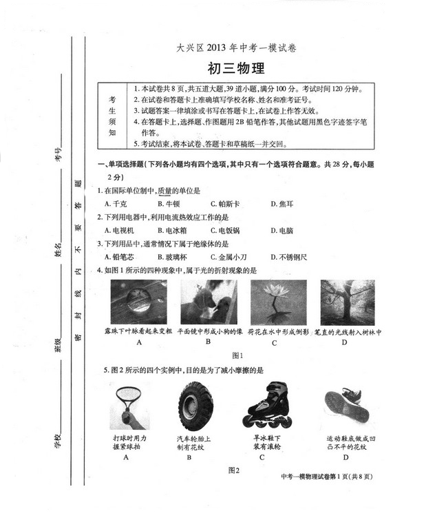 2013年北京市大兴区中考一模物理考试已结束,小编为各位家长、学员整理了考试试卷,以供大家阅读参考: