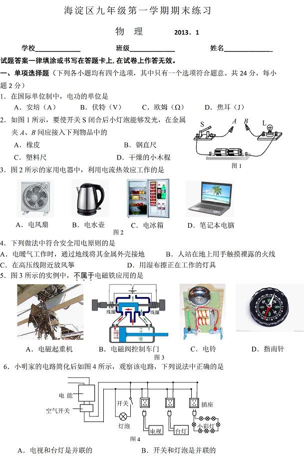 初三物理上学期期末试题及答案(二)