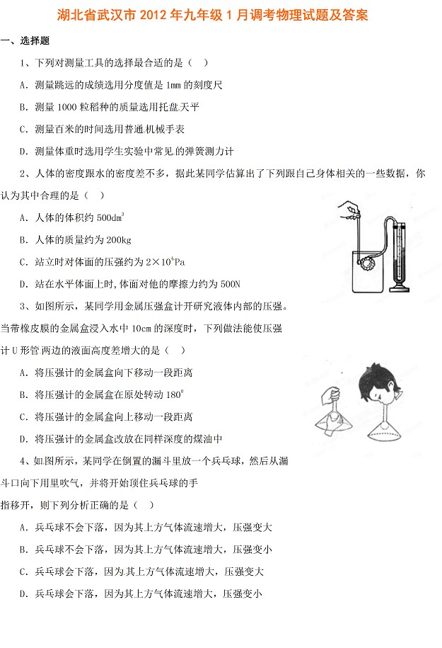 2014初三上学期期末考试即将迎来,学生们都开始了备考阶段。湖北省武汉初中物理上学期期末考试真题汇编,大家可以根据自己的不足强化练习。