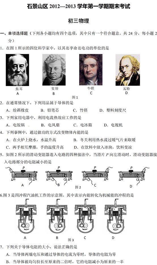2014初三上学期期末考试即将迎来,学生们都开始了备考阶段。北京石景山区初中物理上学期期末考试真题汇编,大家可以根据自己的不足强化练习。