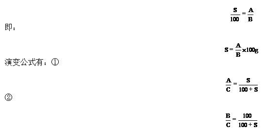 b基本计算公式:若设溶解度为S,饱和溶液中溶质质量为A,溶剂质量为B,溶液质量为C(均以克为单位),则有: