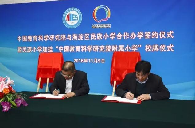2016年11月9日,海淀区民族小学与中国教育科学研究院正式举行合作办学签约仪式,加挂“中国教育科学研究院附属小学”校牌,成为中国教科院在全国唯一的一所附属小学。这将开启国家级科研智库与驻区基础教育学校联合办学、引领驻区学校全面发展的新开端。民族小学在中国教科院的智力支持下会再次腾飞。