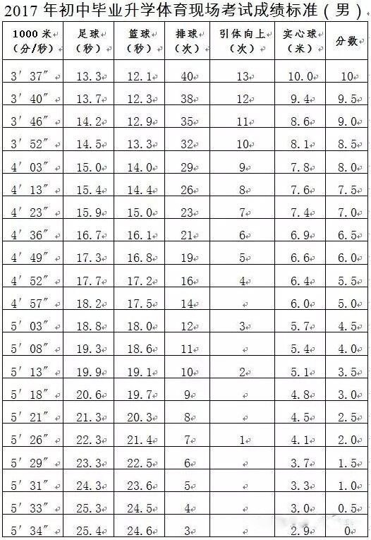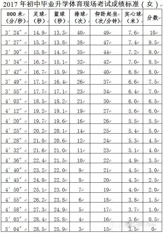 附:2017年初中毕业升学体育现场考试成绩标准: