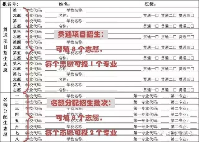 2017年中考志愿分三个批次,依次为提前招生、名额分配招生和统一招生,共设24个志愿。其中,贯通培养招生项目在提前招生中设置志愿批次,可报8个志愿,每个志愿可填报1个专业;名额分配批次和统招批次分别能填报8个志愿,每个志愿可填报2个专业。