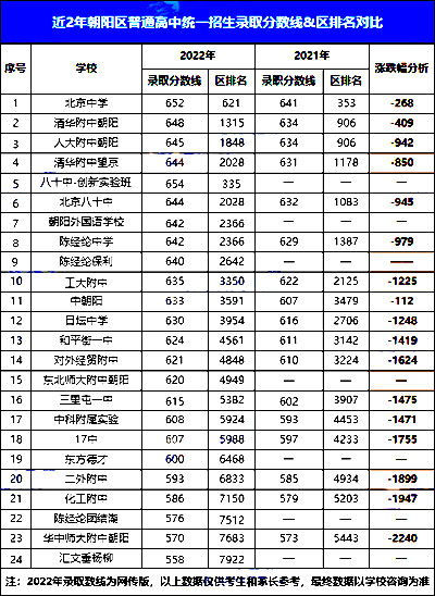 2、通过上述数据可以看出,朝阳区各校区排名均有所下降。下降幅度较小的是二中朝阳和北京中学。
