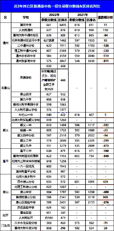 2、由上表可知,丰台区涨跌幅变化不算太大,其中区排名下降幅度最小的是十二中,2022年相比2020年区排名下降362名;区排名下降最为明显的是十中,十中面向本区招生2022年比2021多招生23名,是影响区排名下降的一个重要因素。