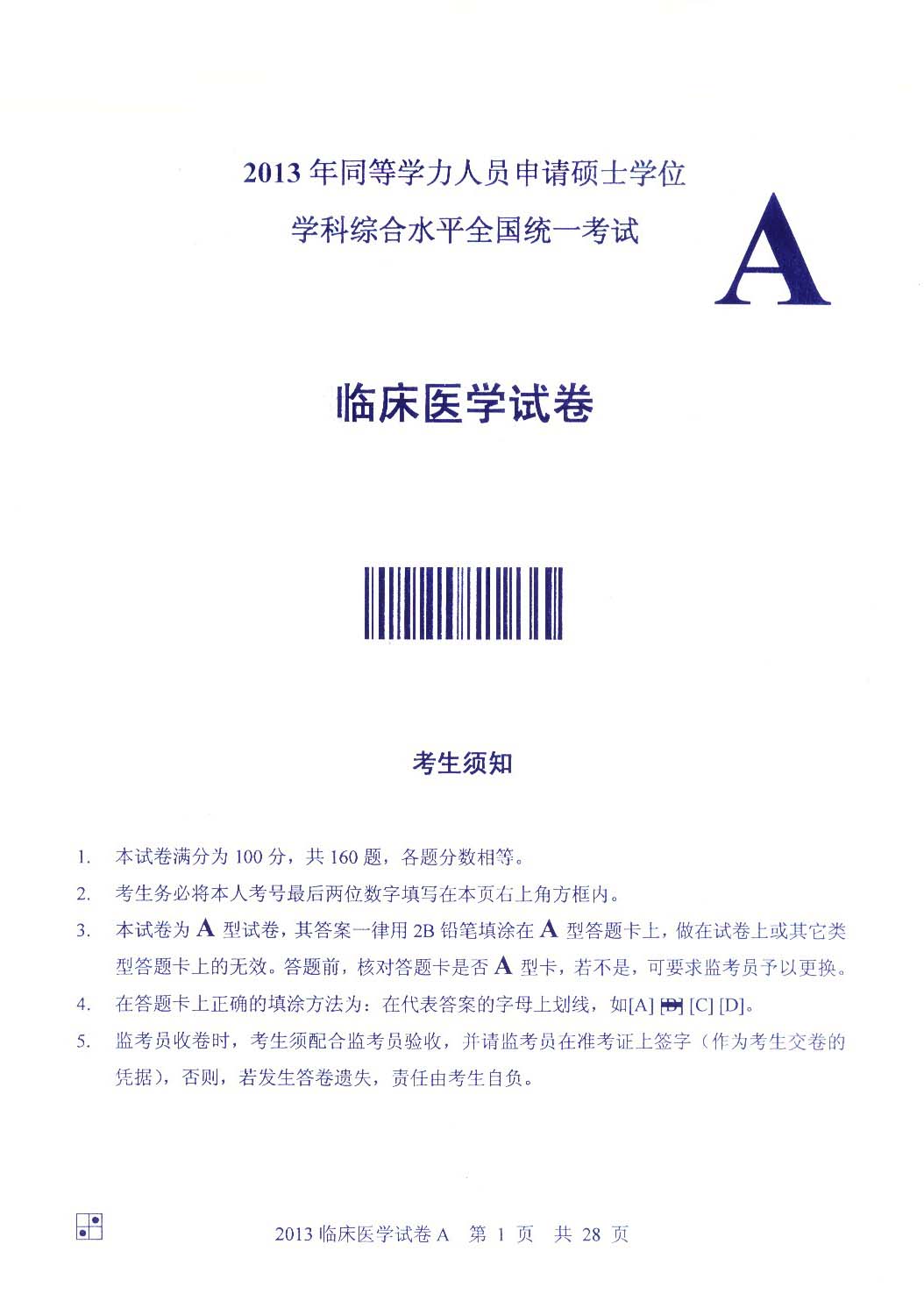 2013同等学力申硕综合真题:临床医学(A卷)