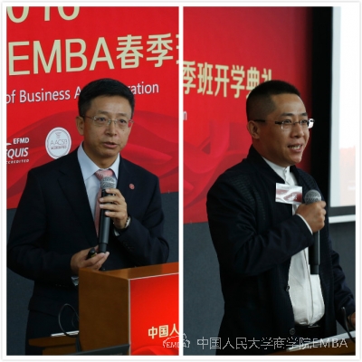 海茵兰茨(天津)工业技术有限公司总经理1204班的宣向斌同学和天津修源皮具有限公司董事长1602班的张杨同学分别作为老生代表和新生代表发言。宣向斌同学分享了自己在人大的深刻学习体会,他认为人大商学院EMBA给与其成长的工具,引发了积极的自我变革。张杨同学期待与所有新同学在人大商学院开启最有价值的学习之旅。