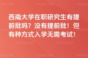 西南大学在职研究生没有提前批。其在职研究生分为同等学力申硕和非全日制研究生两种类型,同等学力申硕随时可报名,非全日制研究生报名参考国家规定时间(一般在每年10月)。学校开设基础兽医学、经济法学等多种专业,学制1.5年,学费3万元。……